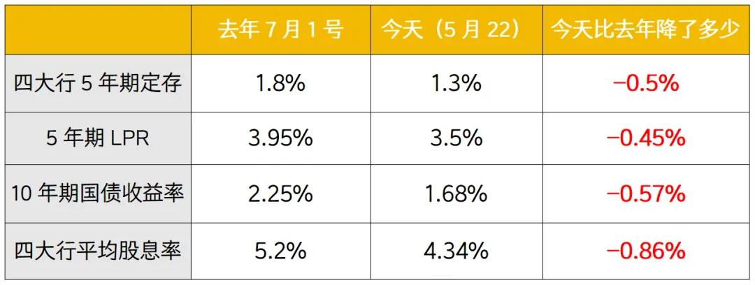 过去一年大行存款降了-0.5%。而贷款,也就是五年期LPR降了-0.45%。
